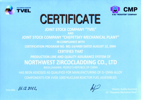 國核鋯業(yè)所屬西北鋯管有限責任公司獲得俄方E110鋯合金生產(chǎn)許可