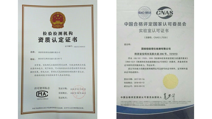 2010年1月6日,公司前身獲得國(guó)家能源局頒發(fā)的“國(guó)家能源核級(jí)鋯材研發(fā)中心”稱號(hào);2011年12月,獲得陜西省科學(xué)技術(shù)廳頒發(fā)的“陜西省核級(jí)鋯材重點(diǎn)實(shí)驗(yàn)室”稱號(hào);2013年5月,獲得CMA資質(zhì);2015年3月31日,獲得CNAS資質(zhì);2016年變更法人和名稱后,又分別取得了CMA和CNAS資質(zhì)。