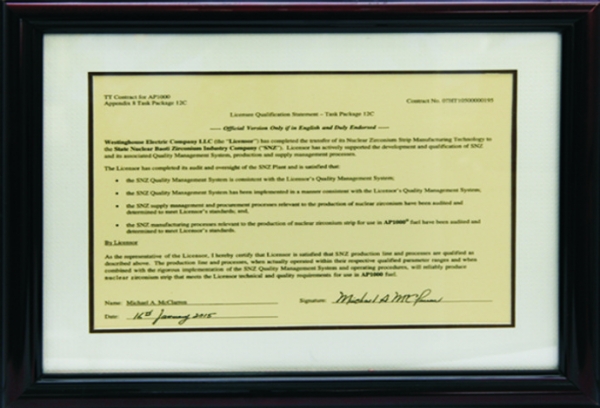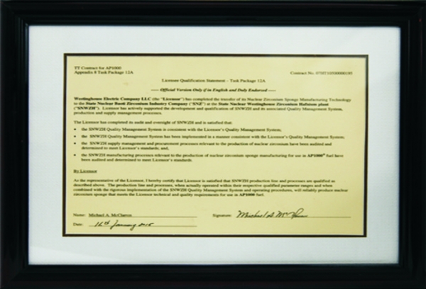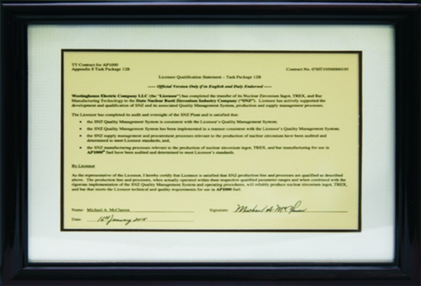 國核鋯業(yè)獲得西屋電氣公司頒發(fā)的AP1000核級鋯材生產(chǎn)線鑒定證書
