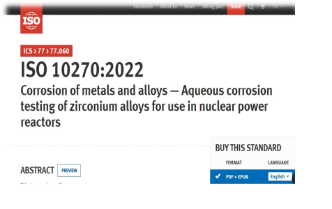 2月9日,由國核鋯業(yè)主導(dǎo)制修訂的國際標(biāo)準(zhǔn)ISO10270:2022《金屬和合金腐蝕-核反應(yīng)堆用鋯合金水溶液腐蝕試驗(yàn)》由國際標(biāo)準(zhǔn)化組織(ISO)正式發(fā)布。該標(biāo)準(zhǔn)是我國核電用鋯材檢測領(lǐng)域首個(gè)正式發(fā)布的ISO國際標(biāo)準(zhǔn),實(shí)現(xiàn)了歷史性突破,對(duì)推動(dòng)我國和國際核級(jí)鋯材材料和評(píng)價(jià)水平整體發(fā)展及核材料檢驗(yàn)技術(shù)提升具有重大意義。