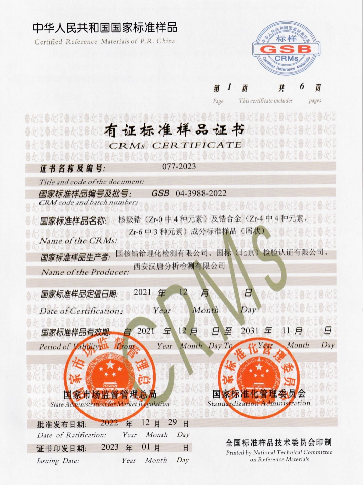 2月27日,理化檢測(cè)收到由國(guó)家市場(chǎng)監(jiān)督管理總局和國(guó)家標(biāo)準(zhǔn)化管理委員會(huì)簽發(fā)的標(biāo)準(zhǔn)樣品證書(shū)。該標(biāo)準(zhǔn)樣品由國(guó)核鋯業(yè)理化檢測(cè)主導(dǎo)研制,經(jīng)全國(guó)有色金屬標(biāo)準(zhǔn)樣品鑒定會(huì)評(píng)審鑒定,是國(guó)內(nèi)首個(gè)獲批的核級(jí)鋯及鋯合金標(biāo)準(zhǔn)樣品,打破了我國(guó)核級(jí)鋯材檢測(cè)溯源、監(jiān)控長(zhǎng)期依賴(lài)進(jìn)口的局面。