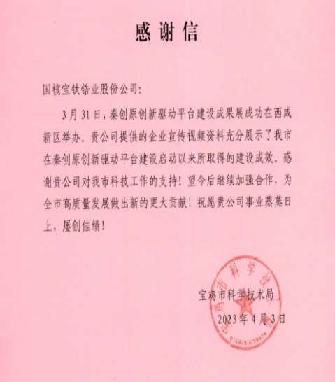 近日,公司收到一封來自寶雞市科學技術局的感謝信,充分肯定了公司在“秦創(chuàng)原創(chuàng)新驅動平臺”建設成果方面做出的努力。