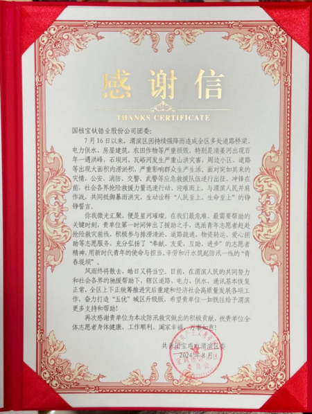 8月12日,公司收到來自共青團寶雞市渭濱區(qū)委的一封感謝信,對前期公司組織青年志愿者積極參與寶雞市防汛救災志愿服務工作表達感謝。