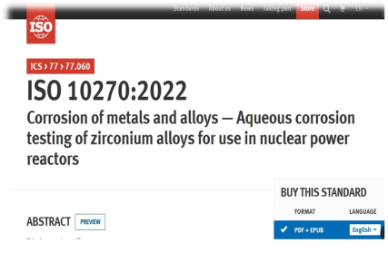 ▲公司制修訂ISO10270:2022《金屬和合金腐蝕—核反應(yīng)堆用鋯合金水溶液腐蝕試驗(yàn)》國際標(biāo)準(zhǔn)