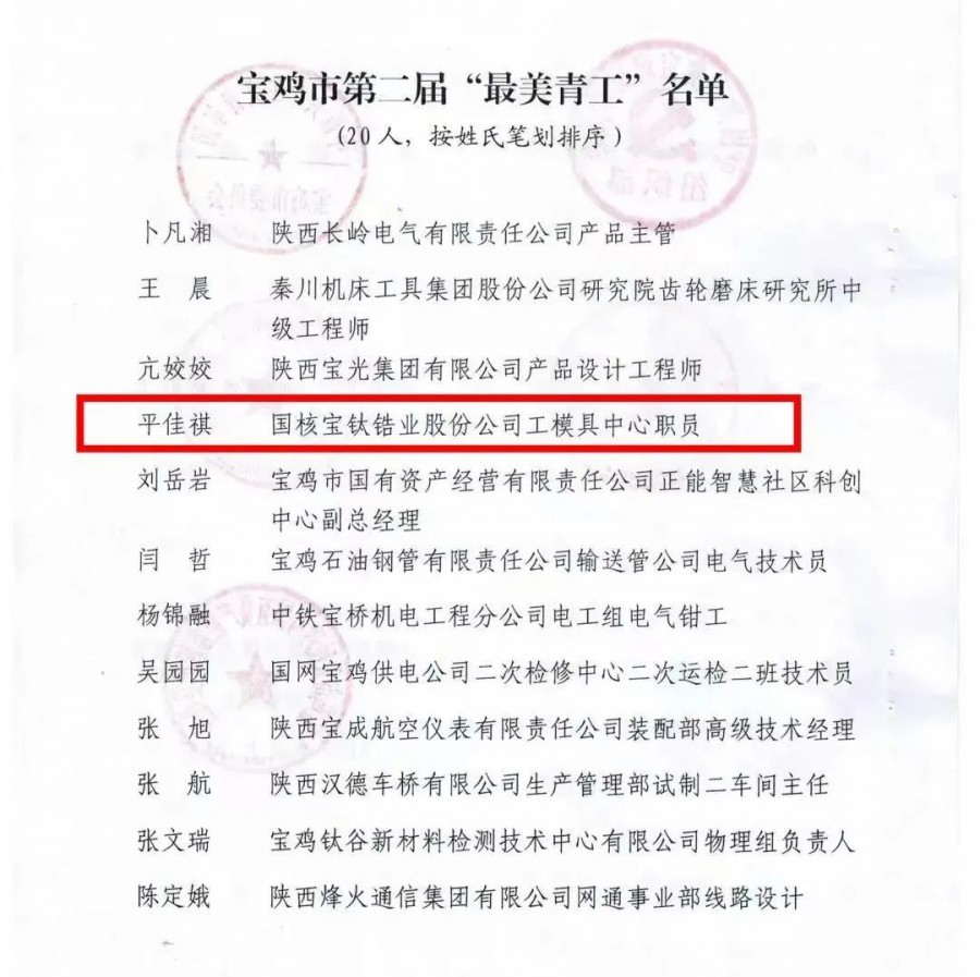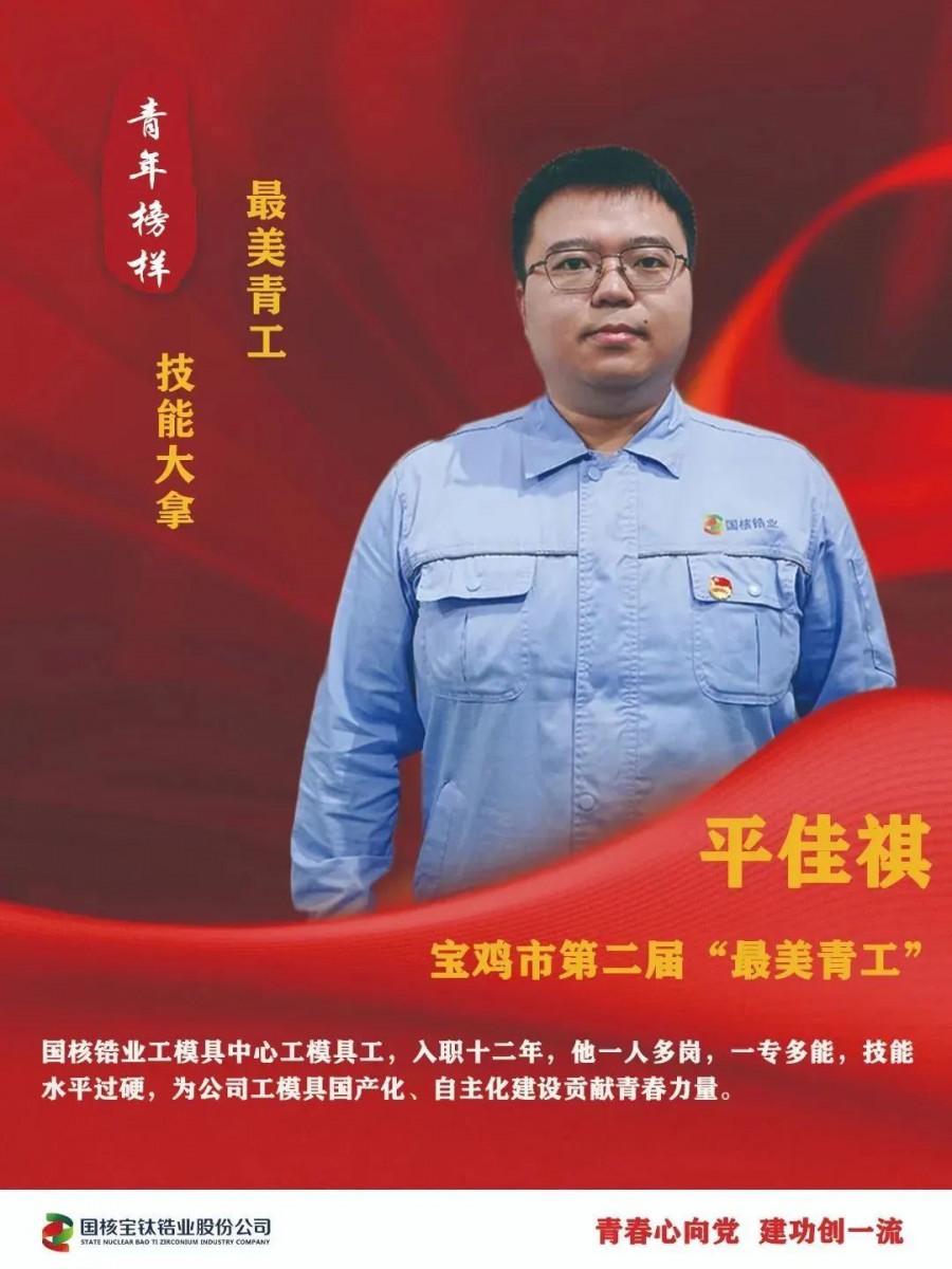 今年五四青年節(jié),國核鋯業(yè)平佳祺獲得寶雞市第二屆“最美青工”榮譽稱號。